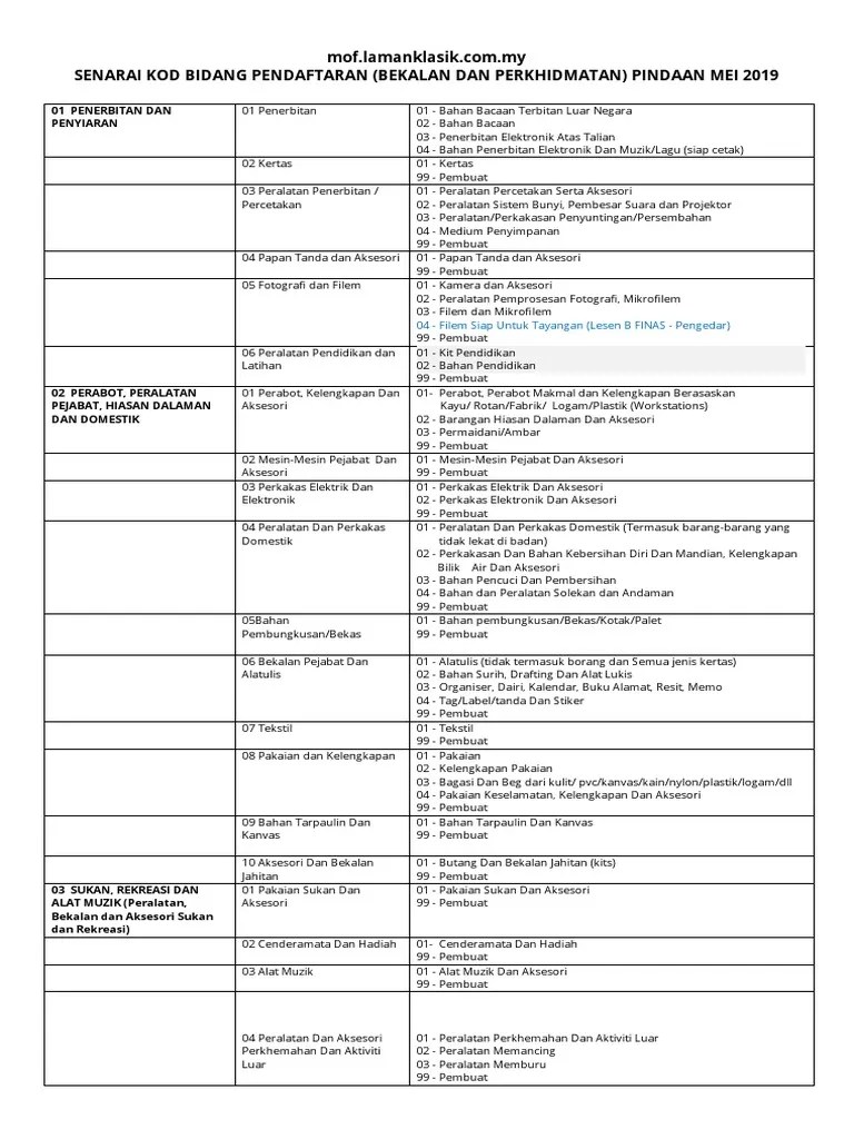 Senarai kod bidang pembekalan dan perkhidmatan · kod bidang yang dibenarkan . Pdf kementerian kewangan malaysia ejam 78 academia edu. Salinan sijil akuan pendaftaran dari kementerian kewangan. Borang tender eperolehan pdf document. Kod bidang 222003 (bill board) (baru).